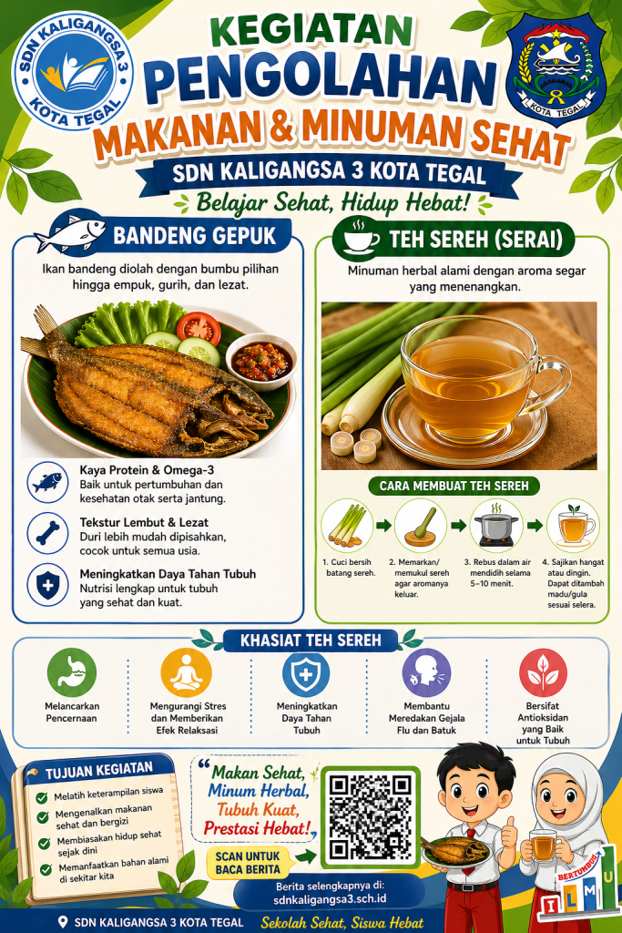 SDN Kaligangsa 3 mengadakan kegiatan edukatif berupa pengolahan makanan dan minuman sehat yang diikuti oleh para siswa. Dalam kegiatan ini, siswa diajarkan cara membuat bandeng gepuk serta minuman herbal teh sereh yang bermanfaat bagi kesehatan.